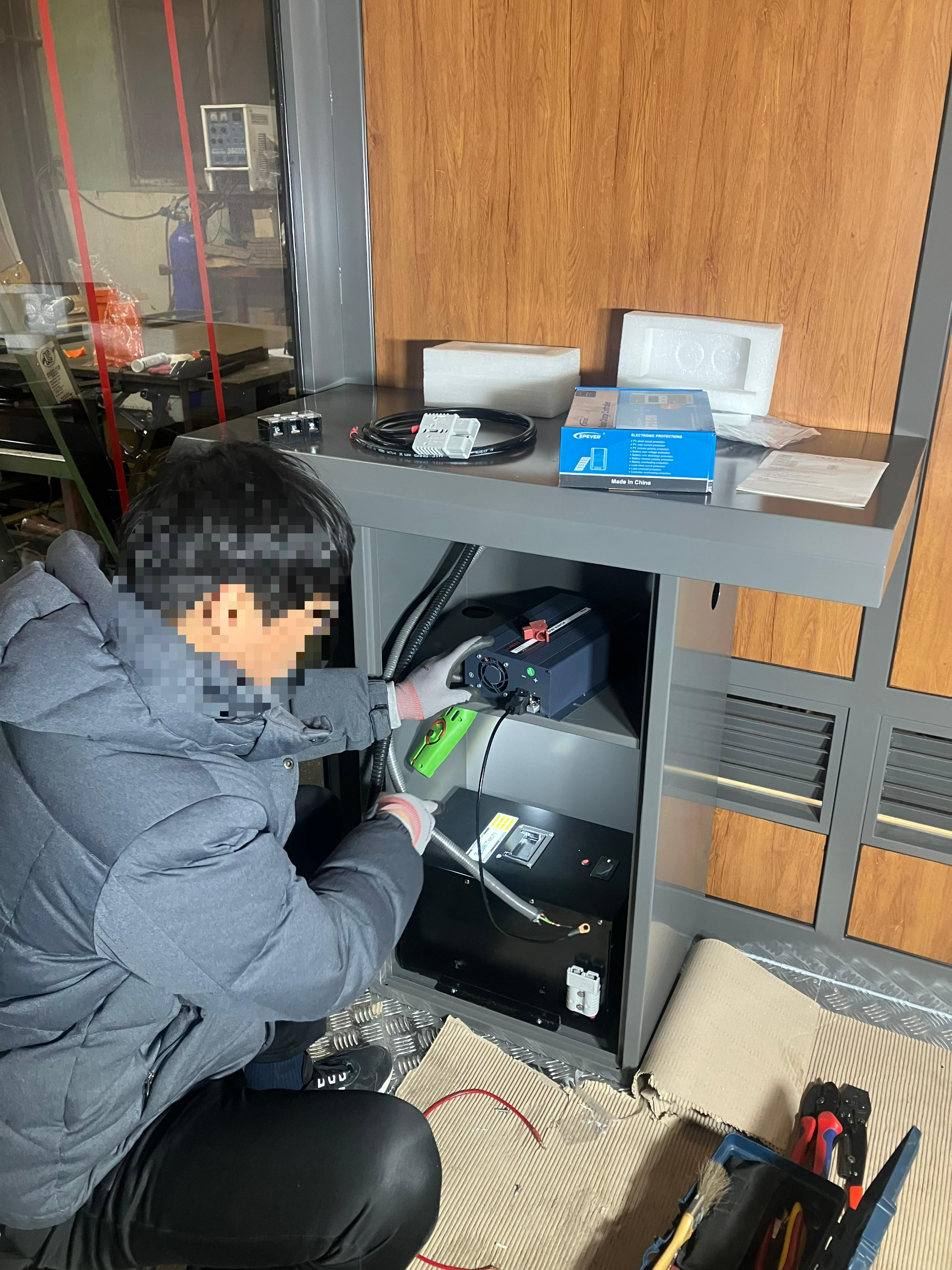 과거 제작하였던 독립형 태양광 흡연부스를 추가로 제작하였습니다. 2가지 모델로 제작하였는데 고객이 원하는 모델은 어떤것이 더 좋을지는. 작업은 동일하게 배터리, 인버터, 태양광 컨트롤러가 장착됩니다. 사용용도에 맞게 배터리 역시 2종으로 나뉘어 설치를 하였습니다.
